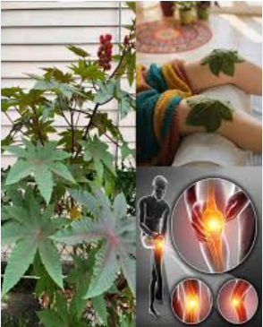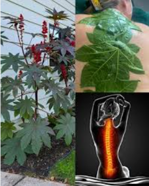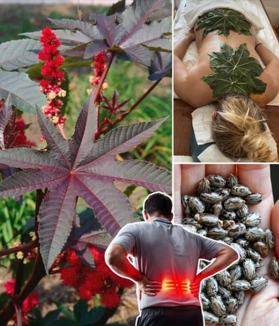 The plant shown in the image appears to be the castor plant (Ricinus communis). While most people are familiar with castor oil, fewer realize that the leaves themselves have also been used in traditional external applications.